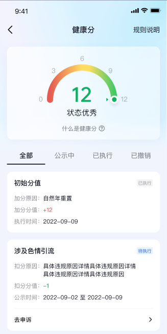 你是不是也遇到上面类似的问题,不知道发生了什么就被处罚了,不知道往哪里反馈问题进行申诉?帮你了解自己目前账号的健康状况,快速查询违规原因,一键提交判罚申诉等问题健康分是平台基于国家法律法规、监管要求、平台协议等规定,结合线索经营商家的行为表现,设立的一套商家管控体系。该体系覆盖线索经营的全链路,集成现行多方的处置能力,统一采取『健康分』的形式对用户管控和展示,从而建立有序、良好、健康的平台生态环境。平台规则繁杂、不易理解,判罚场景更是让人眼花缭乱,「健康分」集合各场景下的管控规则,用户只需了解关注健康分管控规则即可应对平台做出的所有管控动作。