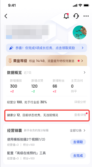 目前平台的处罚通知主要以站内信通知为准,用户经常反馈未收到处罚通知,账号突然被封等情况,申诉链路较长,操作相对复杂。「健康分」可以让你在商家后台更直观地了解违规原因和判罚情况。如对判罚不认可,还可以支持一键发起申诉。【健康分入口】打开抖音app,点击企业服务中心,进入企业号(线索版)商家后台即可在中间菜单栏看到健康分入口